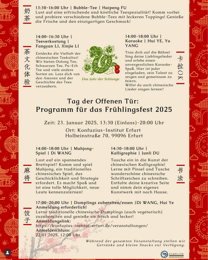 Das Konfuzius-Institut Erfurt lädt Sie herzlich ein, mit uns das chinesische Frühlingsfest und den Beginn des Jahres der Schlange zu feiern!